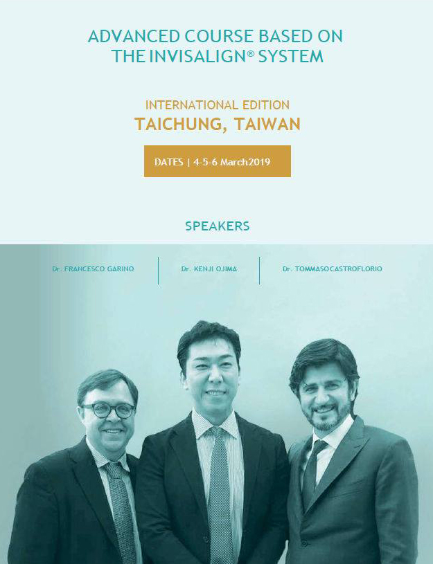 ADVANCED COURSE BASED ON THE INVISALIGN(R) SYSTEMLOCATION:TAICHUNG, TAIWAN SCHEDULE:4-5-6 March 2019 SPEAKERS:Dr. FRANCESCO GARINO Dr. KENJI OJIMA Dr. TOMMASO CASTROFLORIO |