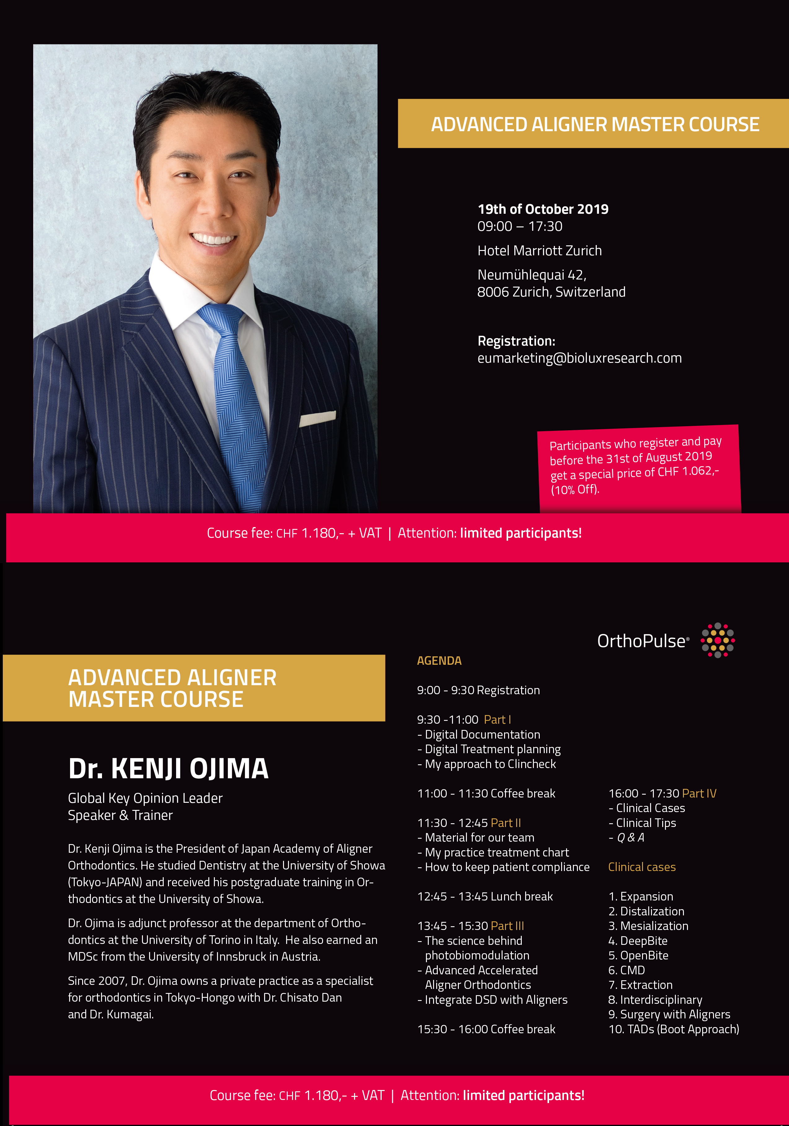 ADVANCED ALIGNER MASTER COURSELOCATION:Hotel Mandarin Oriental Quai Turrenttini 1,1201 Genève, Switzerland SCHEDULE:6. April 2019 09:00 - 17:30 SPEAKERS:Dr. KENJI OJIMA Global Key Opinion Leader Speaker & Trainer |